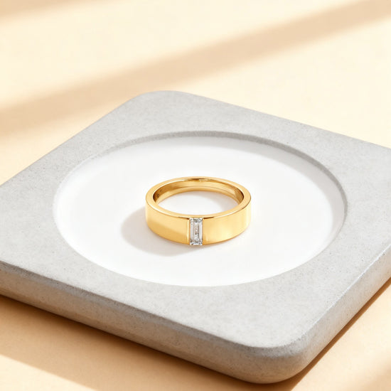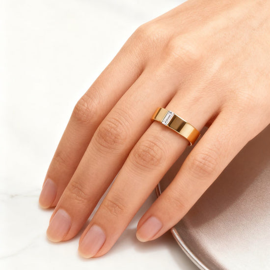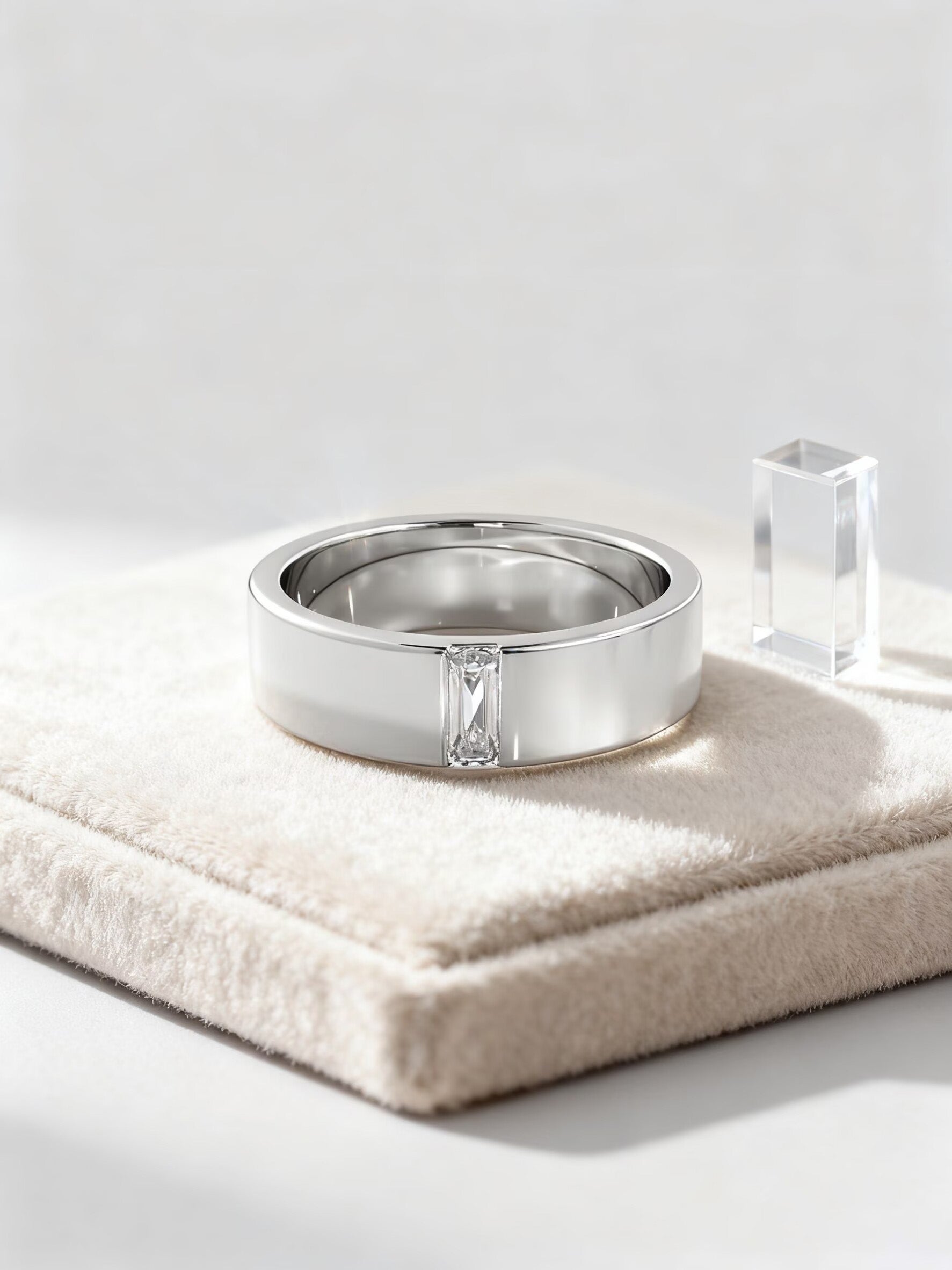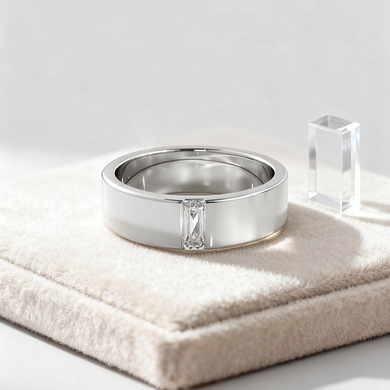 A modern and refined men’s band designed for those who appreciate minimalism with a touch of brilliance. This ring features a single baguette cut diamond elegantly set into a wide, polished band, creating a clean and masculine silhouette. The elongated baguette stone adds sophistication while maintaining an understated, timeless look. Ideal as a wedding band, anniversary ring, or a daily signature piece, this design blends contemporary style with classic craftsmanship.