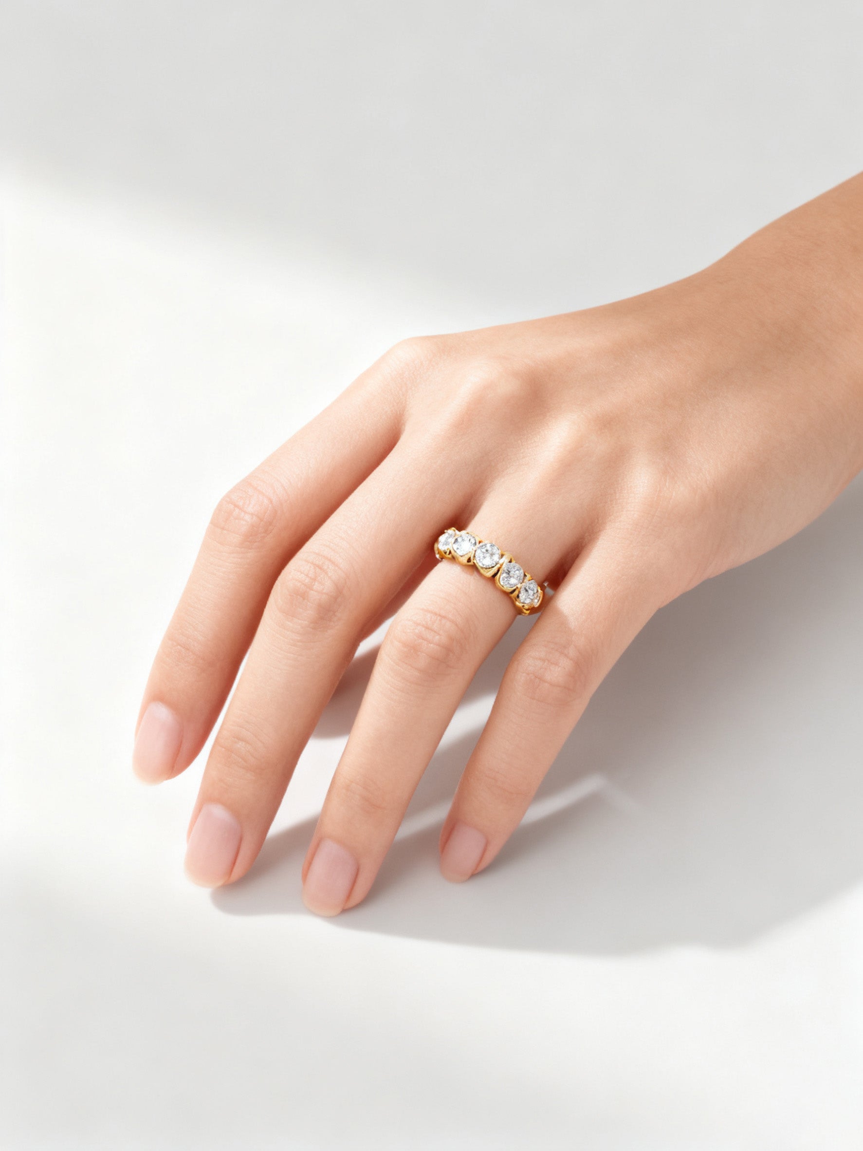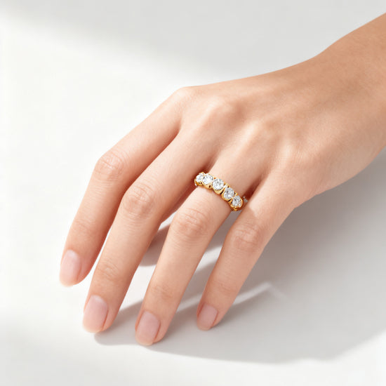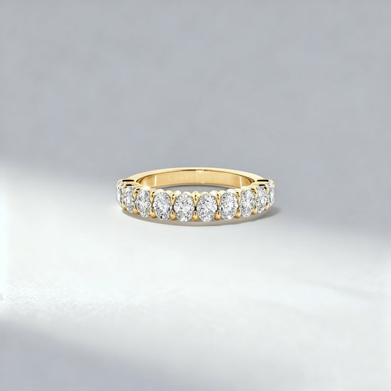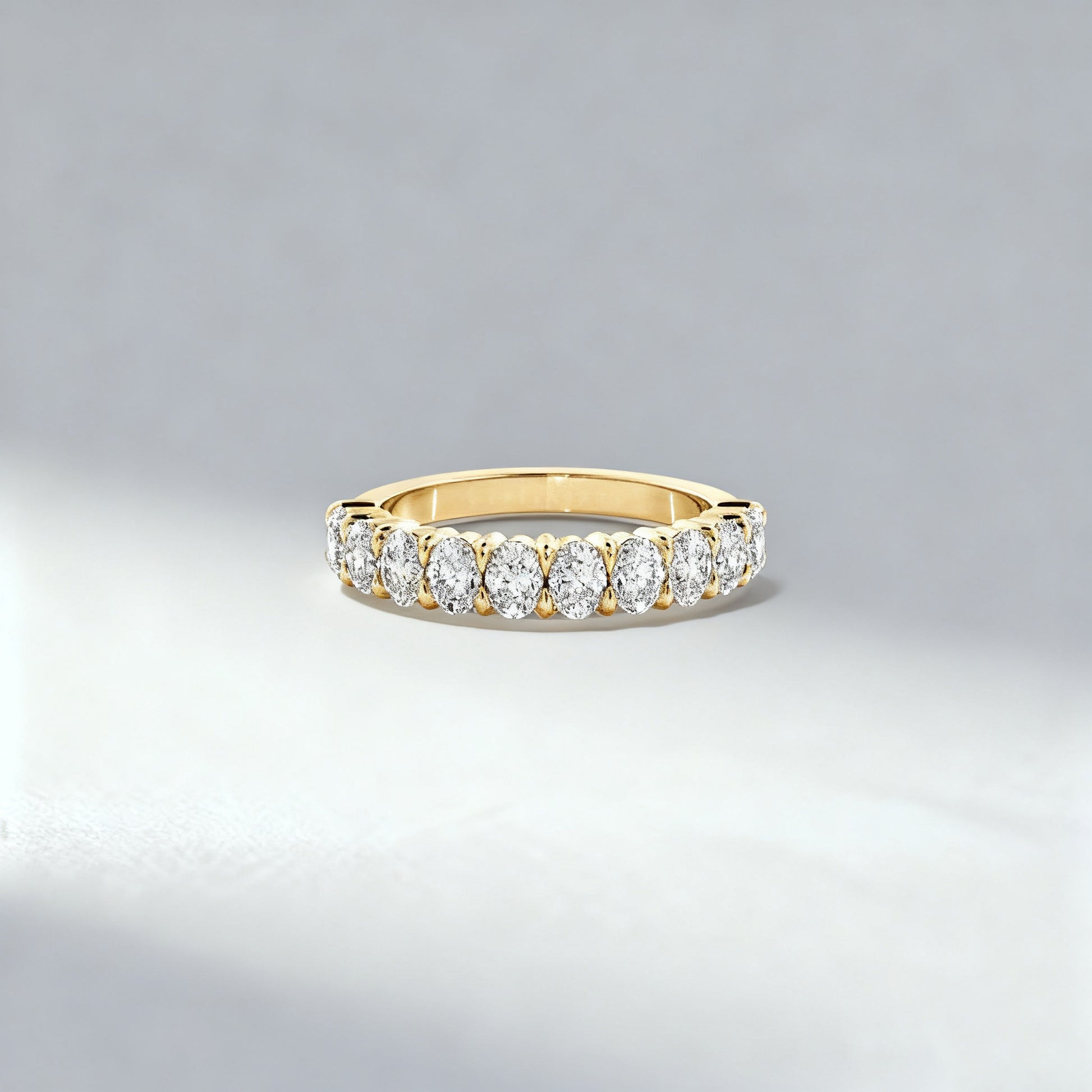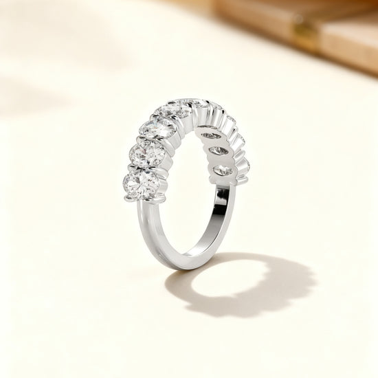 A refined interpretation of timeless brilliance, this half-circle eternity ring features a continuous row of oval-cut lab-grown diamonds, each precisely set to maximize fire and symmetry. The elegant scalloped setting enhances light return, creating a seamless ribbon of sparkle along the finger. Perfect as a wedding band, anniversary ring, or sophisticated stacking piece.