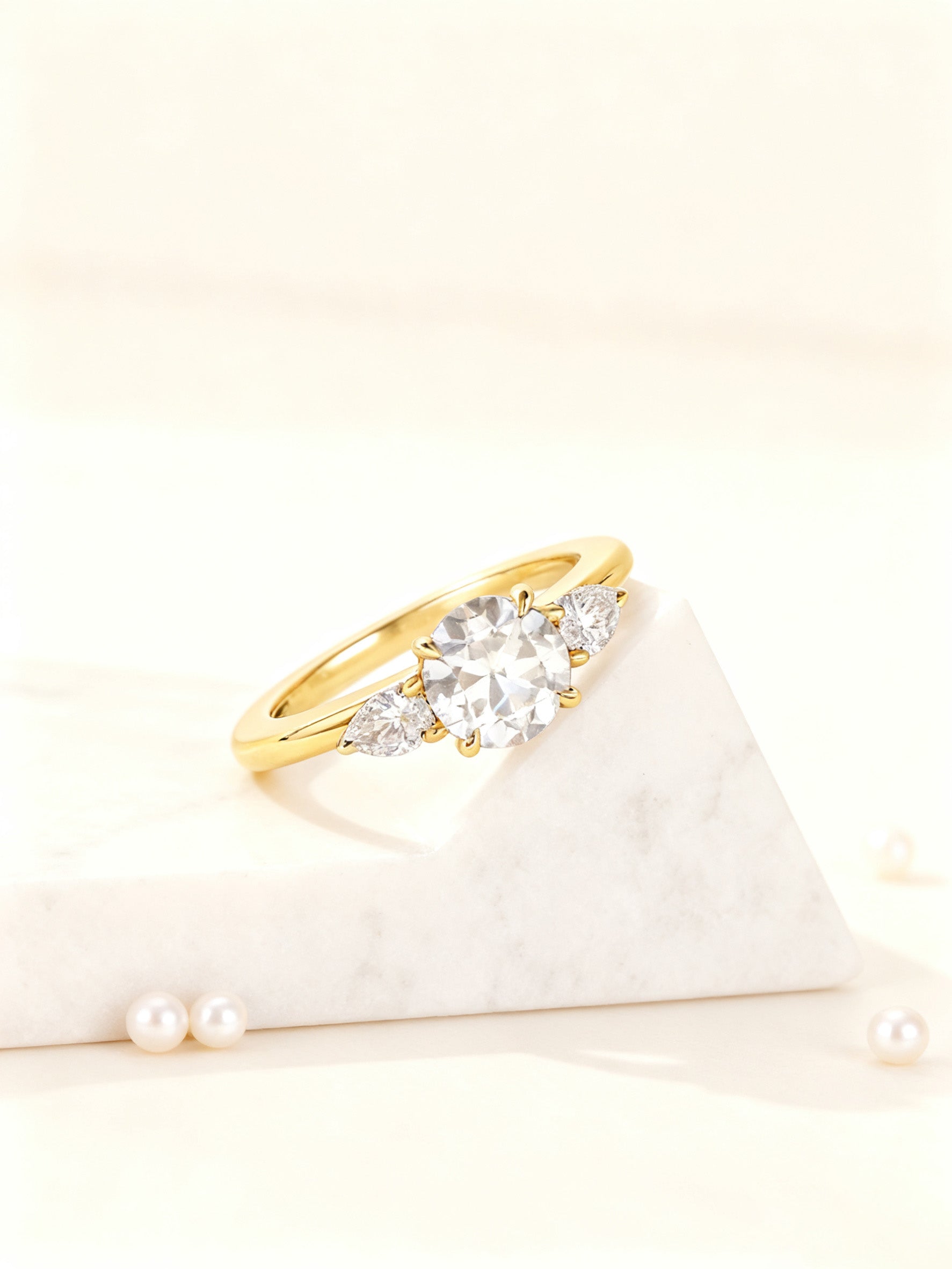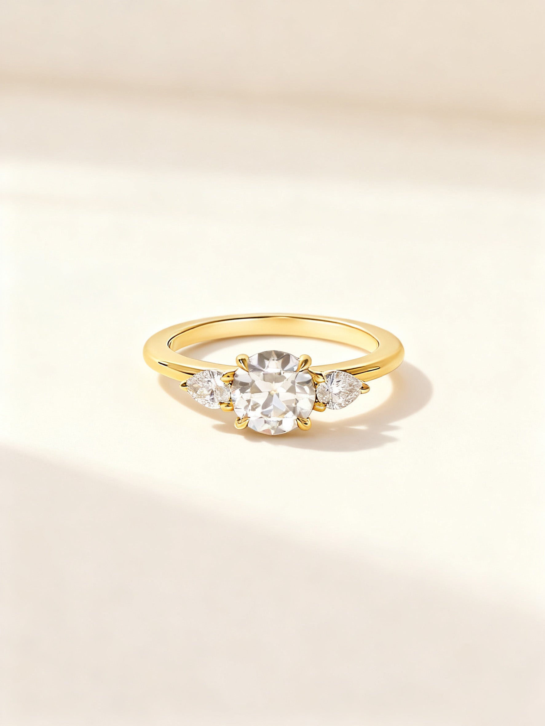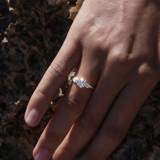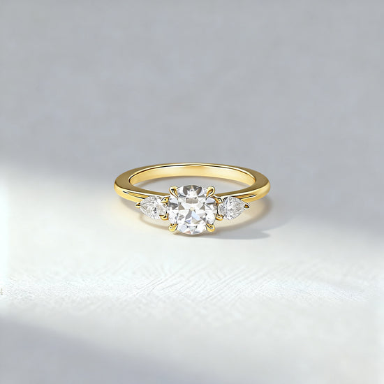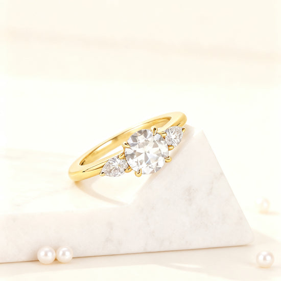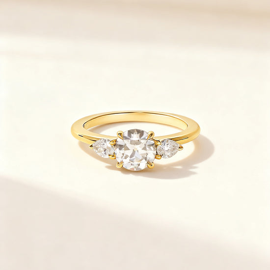 A timeless symbol of harmony and elegance, this Mia Liora Three-Stone Ring features a brilliant 1.00 ct Round Cut centre diamond flanked by two perfectly matched Pear Cut side stones.