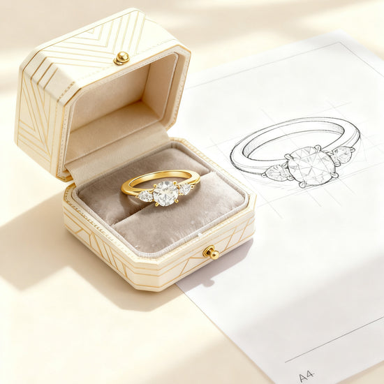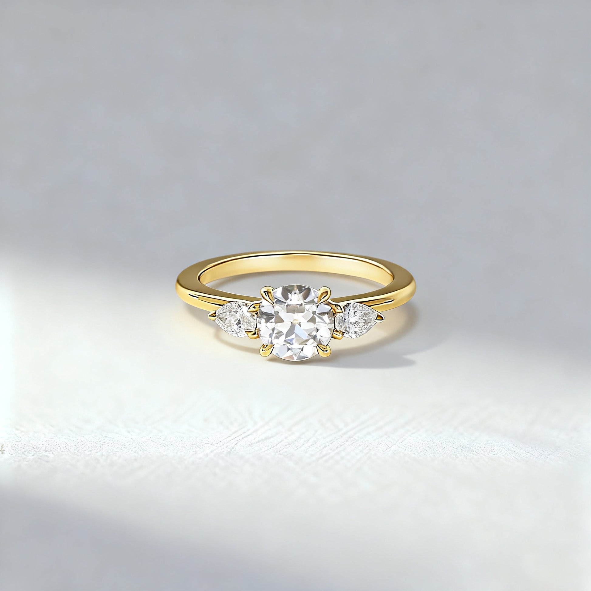 The Round centre stone offers classic fire and brilliance, while the Pear Cut wings add a soft, romantic silhouette that frames the centre diamond beautifully. This balanced three-stone design represents your past, present, and future — making it a meaningful choice for engagements, anniversaries, or milestone moments.