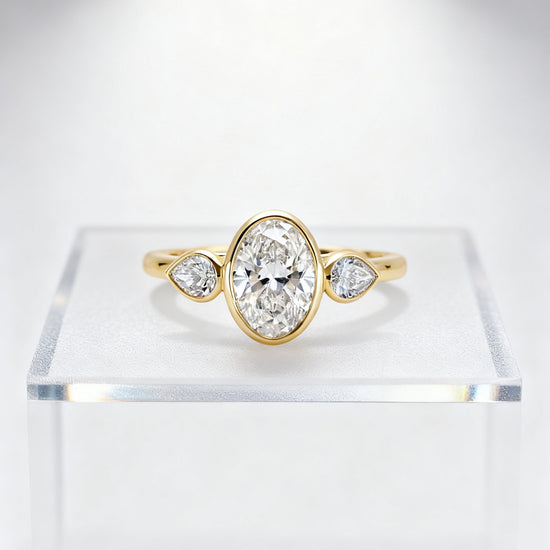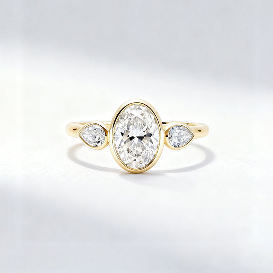 3.00 ct Oval Lab Grown Diamond Three-Stone Bezel Ring with Pear Side Stones