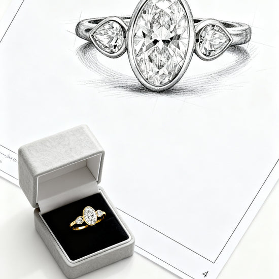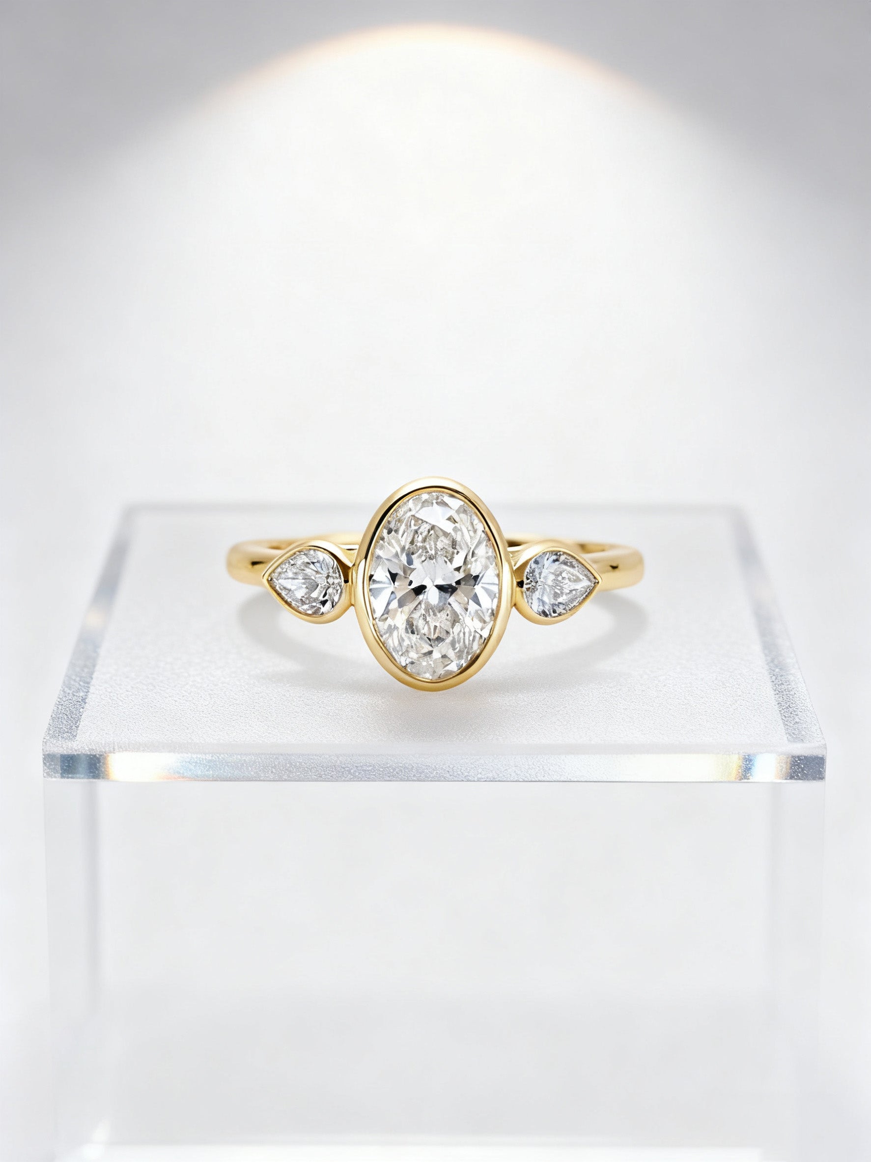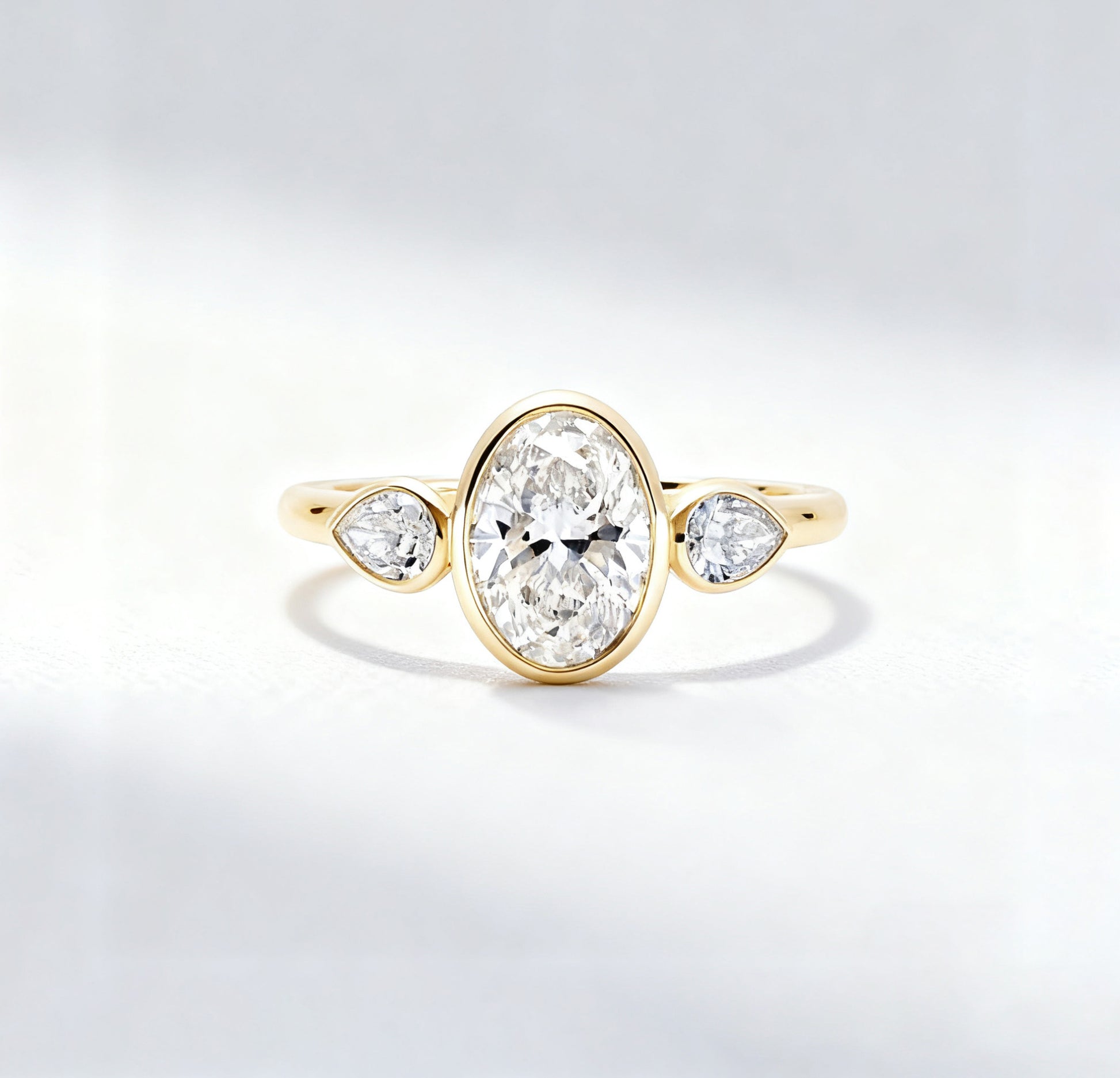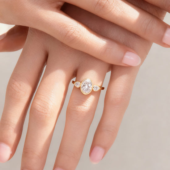 Elegant and sculptural, Mia Liora’s 3.00ct Oval Bezel-Set Lab-Grown Diamond Ring with Pear-Cut Side Stones redefines the classic three-stone silhouette with modern refinement.