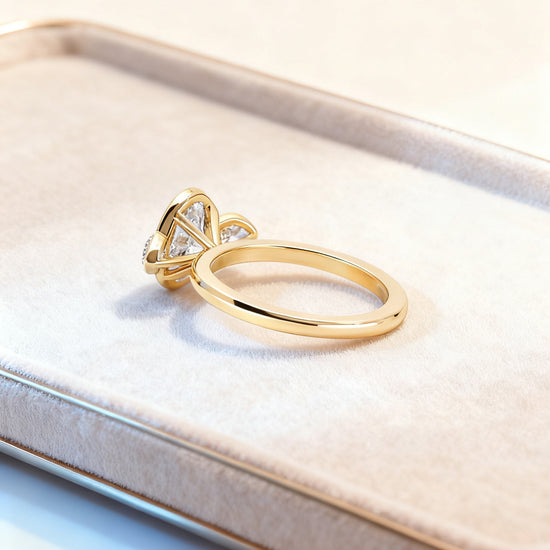 The centre oval diamond is securely embraced by a full bezel frame, enhancing its brilliance while giving the piece a sleek, contemporary profile. Two pear-cut side diamonds sit gracefully on each wing, symbolising past, present, and future in perfect harmony.