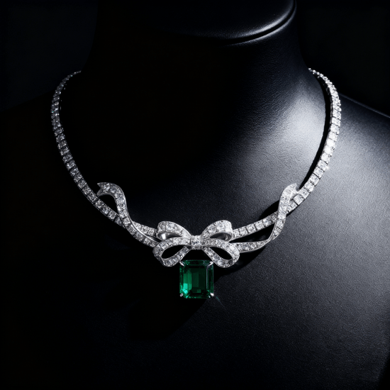 Charming and refined, Mia Liora’s 10.00ct Emerald-Cut Green Gemstone & Lab-Grown Diamond Bow Necklace captures the essence of timeless femininity with a modern twist. The necklace features a stunning emerald-cut green gemstone at its center, symbolizing grace and vitality. A delicately sculpted diamond bow, adorned with D–F color, VVS/VS clarity lab-grown diamonds, adds a touch of playful sophistication. The surrounding diamond collar creates a continuous shimmer, perfectly framing the neckline. Crafted in PT950 Platinum or 18K Gold, this piece embodies the art of fine jewelry, elegant, ethical, and enduring.