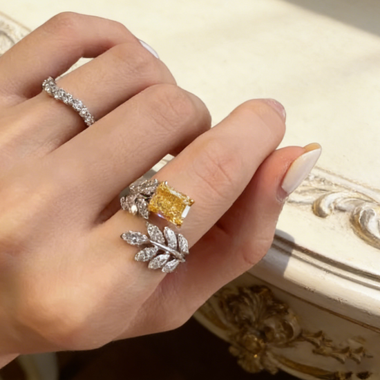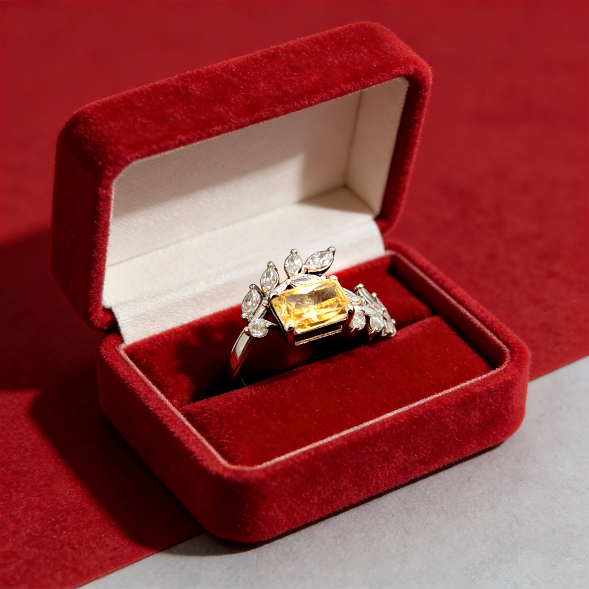 A bespoke design inspired by the elegance of nature and the symbolism of renewal. This custom crafted ring features a 2.00 ct emerald cut lab grown diamond as the centrepiece, celebrated for its clarity, clean lines and timeless sophistication. On each side rests a pair of pear cut diamonds totalling 0.770t, forming a graceful maple leaf silhouette that enhances depth, brilliance and flow. Handcrafted in PT950 platinum, this ring blends artistry with meaning, making it a perfect choice for those who appreciate refined design with a personal touch.