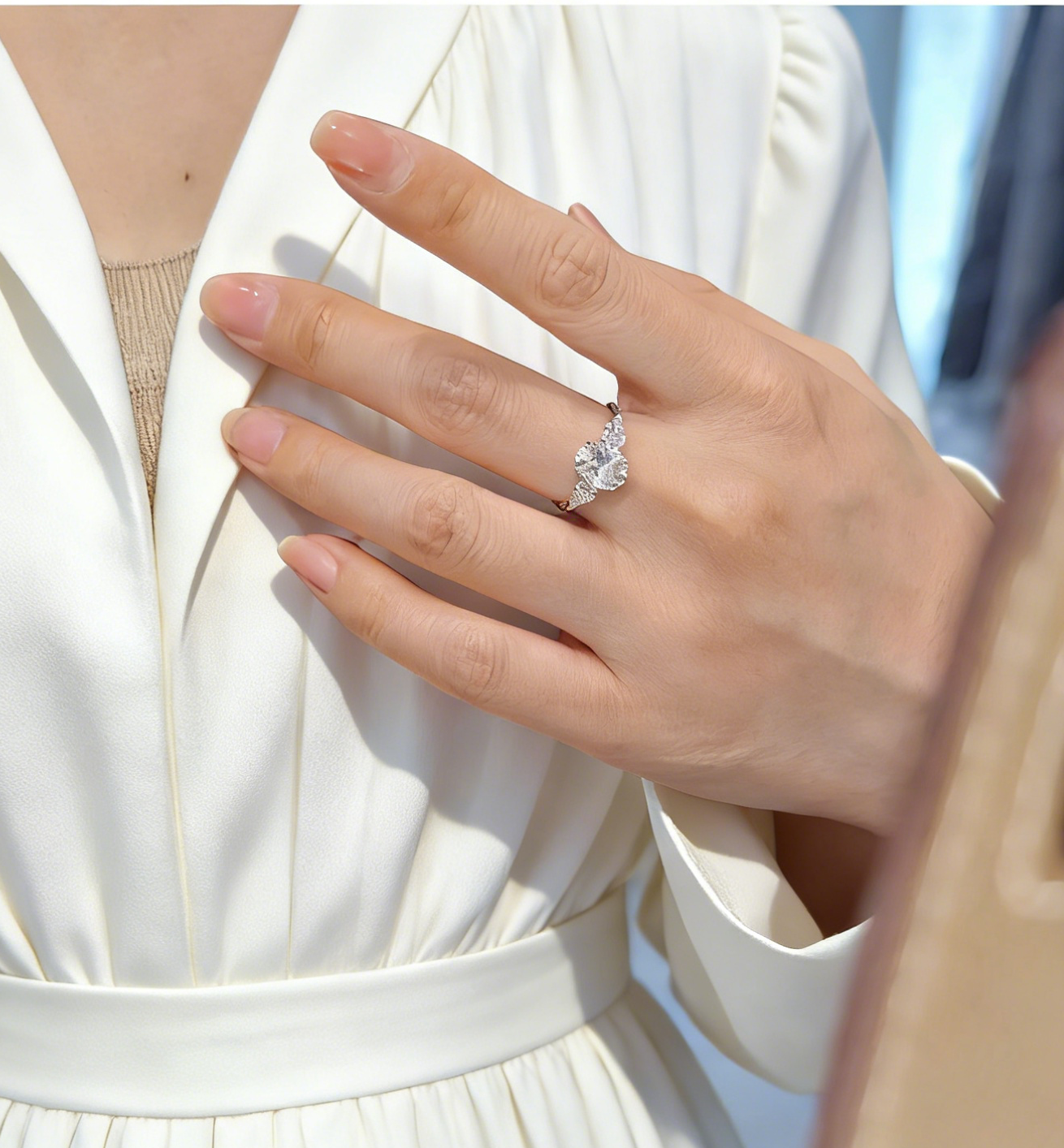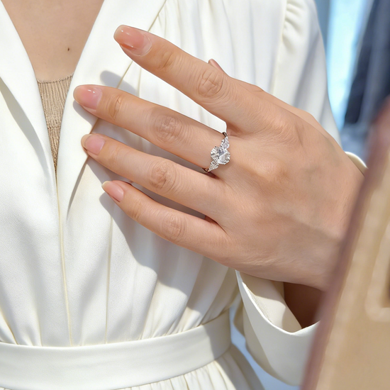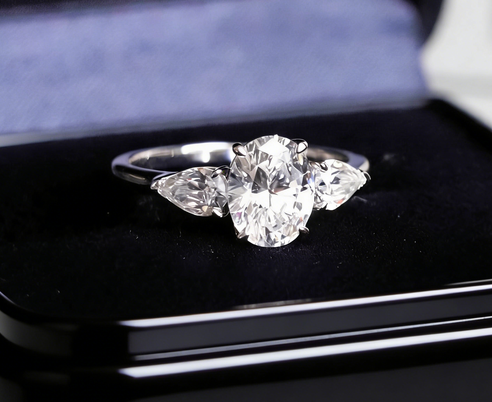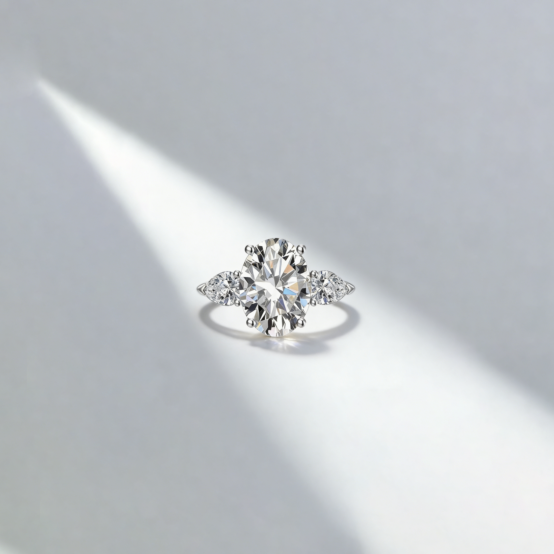 On each side, perfectly matched (0.65 ct in total) pear cut diamonds add a soft, tapering shimmer that enhances the centre stone while creating a harmonious, feminine contour. The pairing of oval and pear cuts produces a seamless cascade of sparkle, elevating this design into a true modern classic.