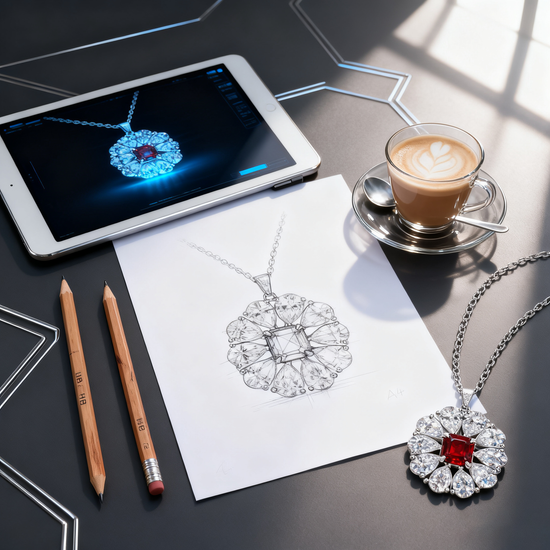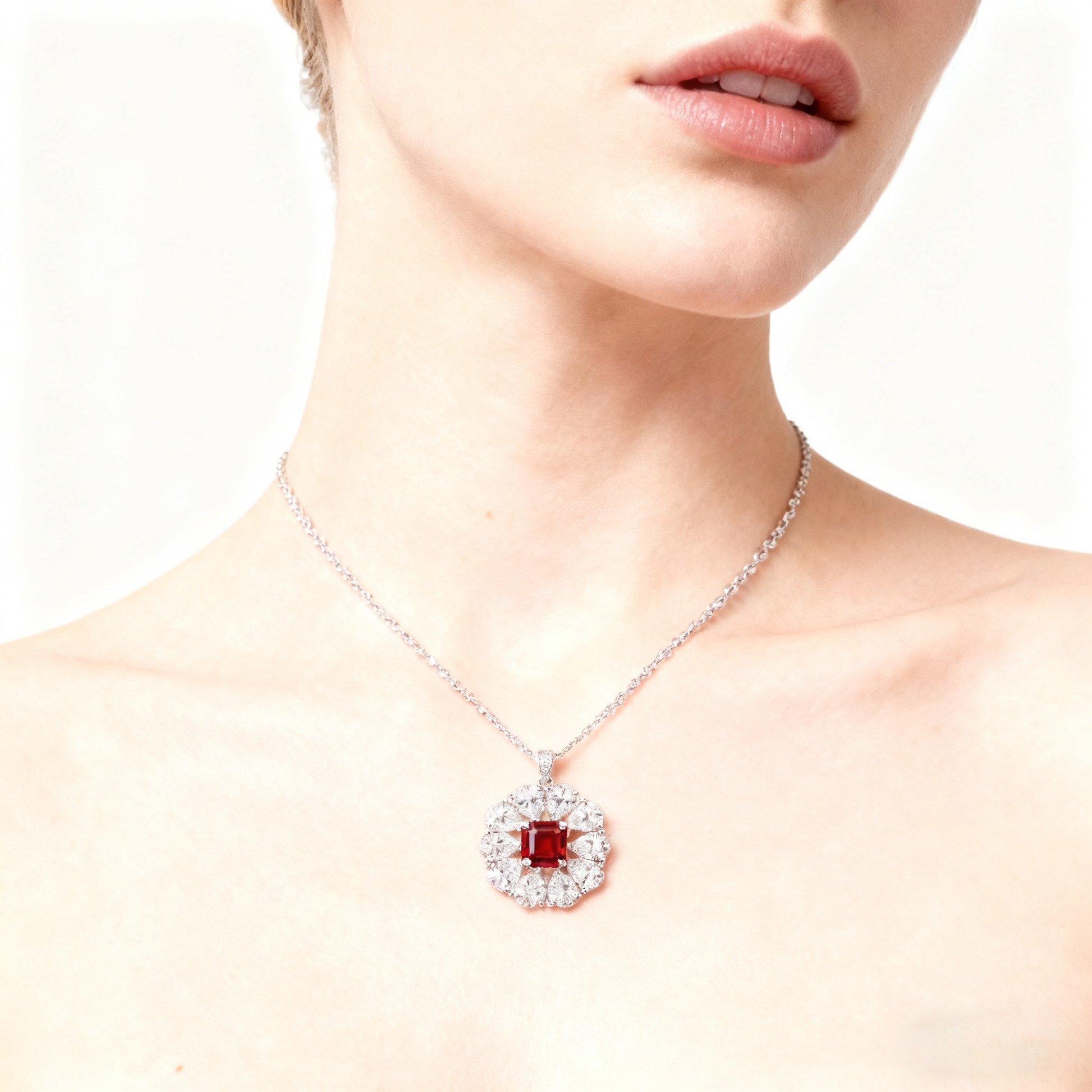 The 3.00ct Cushion Cut Ruby and Lab Grown Diamond Necklace captures the allure of timeless sophistication. A rich, scarlet ruby takes center stage — cut to perfection in a cushion silhouette — surrounded by a radiant halo of hand selected lab grown diamonds that reflect brilliance from every angle. Designed to sit elegantly on the neckline, this masterpiece combines fiery passion with enduring grace. Crafted in PT950 Platinum or 18K Gold, it embodies refined beauty that never fades.