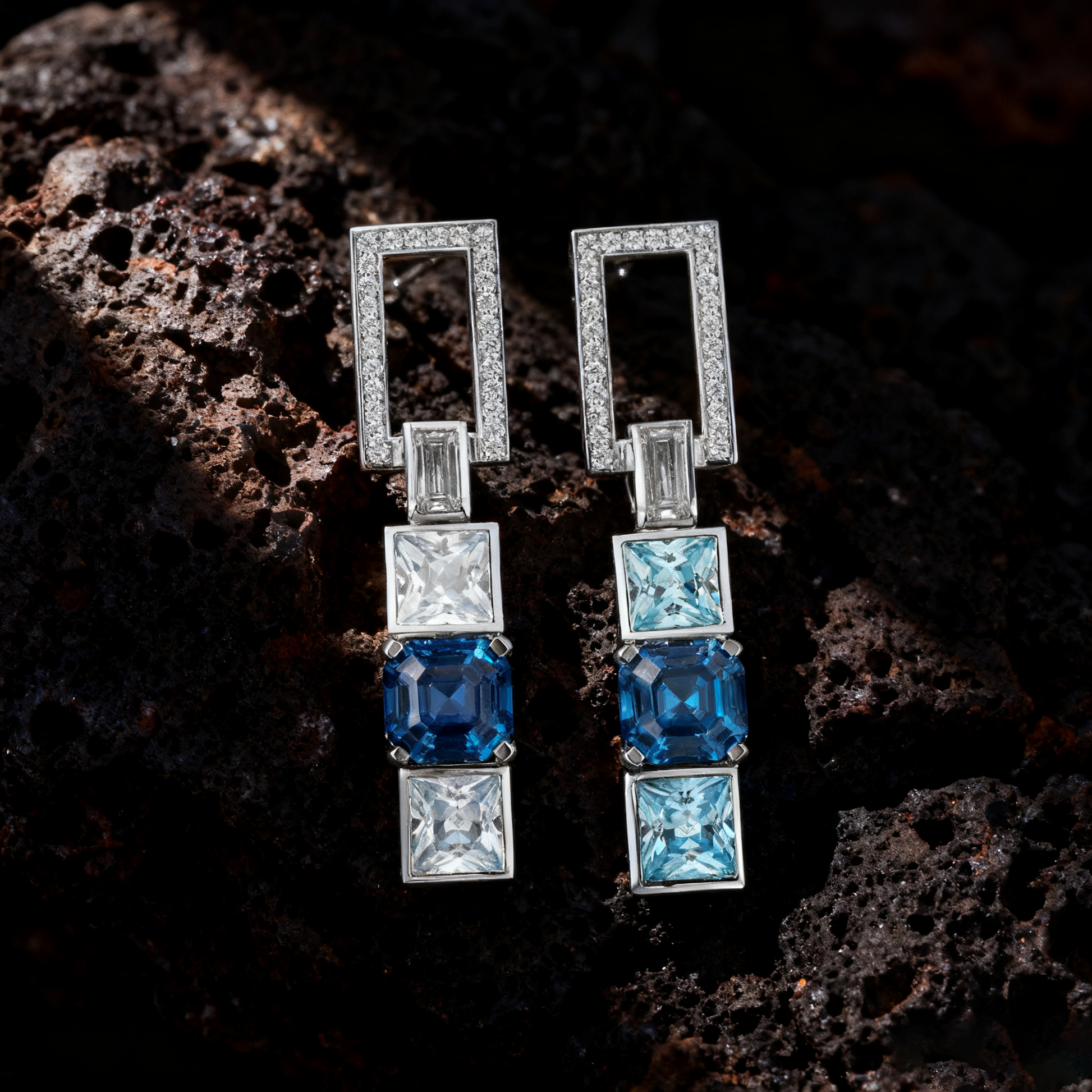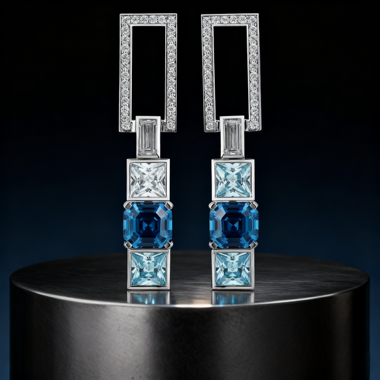 Modern and refined, Mia Liora’s 3.00ct Ocean Blue Paraiba and Lab Grown Diamond Art Deco Azure Luminance Drop Earrings reinterpret timeless Art Deco elegance with a contemporary edge. Each earring showcases a stunning 3.00ct arrangement of Paraiba tourmalines and lab grown diamonds in geometric precision, blending oceanic blue brilliance with icy diamond radiance. The clean architectural lines, paired with hand set craftsmanship, create a bold yet sophisticated statement. Crafted in PT950 Platinum or 18K Gold, this design embodies modern artistry, sustainable luxury, and individuality.