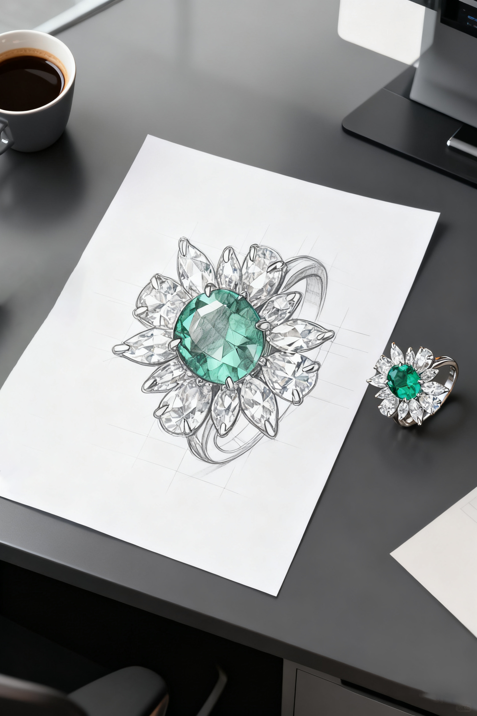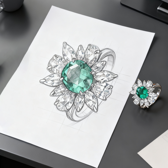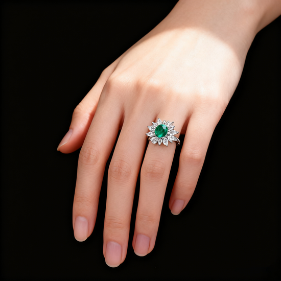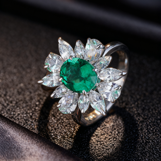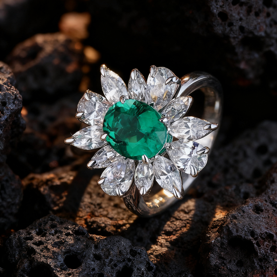 The Verdant Grace Emerald and Lab Grown Diamond Floral Ring blooms with nature-inspired elegance and timeless sophistication. Centered by a vivid green emerald, this exquisite design is surrounded by a halo of marquise and pear-cut lab grown diamonds that radiate outward like delicate petals. Each gemstone is precisely hand-set to capture the natural brilliance of a flower in full bloom, creating a mesmerizing play of light and color. Crafted in PT950 Platinum or 18K Gold, this ring combines romantic artistry with modern refinement — a true statement of grace and individuality.
