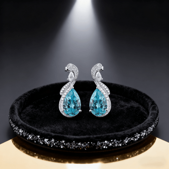 Captivating and luminous, Mia Liora’s 8.00ct Pear-Cut Ocean Blue Gemstone & Lab-Grown Diamond Drop Earrings evoke the serenity of ocean waves captured in fine jewelry. Each earring features a breathtaking Paraiba tourmaline — renowned for its vivid neon-blue hue — gracefully surrounded by pavé-set lab-grown diamonds that shimmer with every movement. The fluid drop design enhances the gemstone’s brilliance, creating a mesmerizing balance of color and light. Handcrafted in PT950 Platinum or 18K Gold, these earrings embody refined artistry, sustainable luxury, and timeless sophistication — perfect for evening elegance or special occasions.