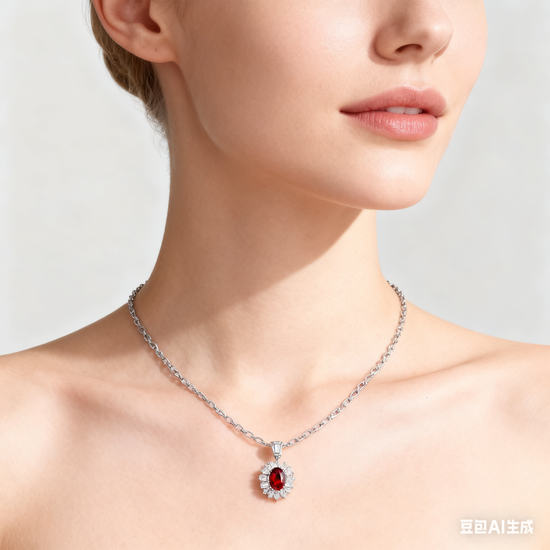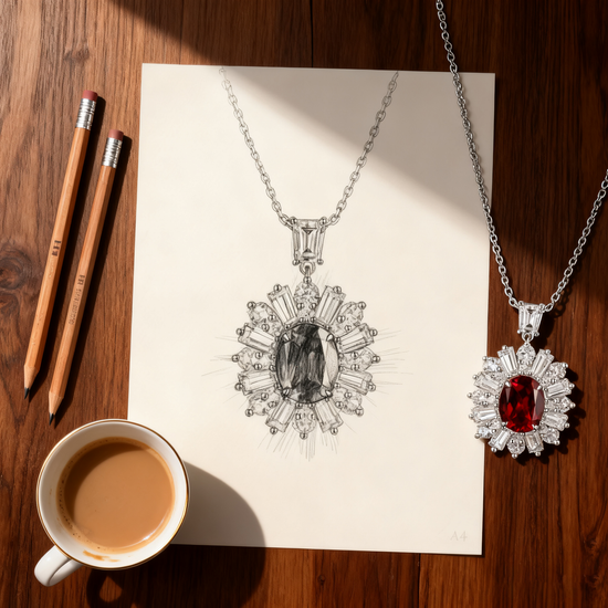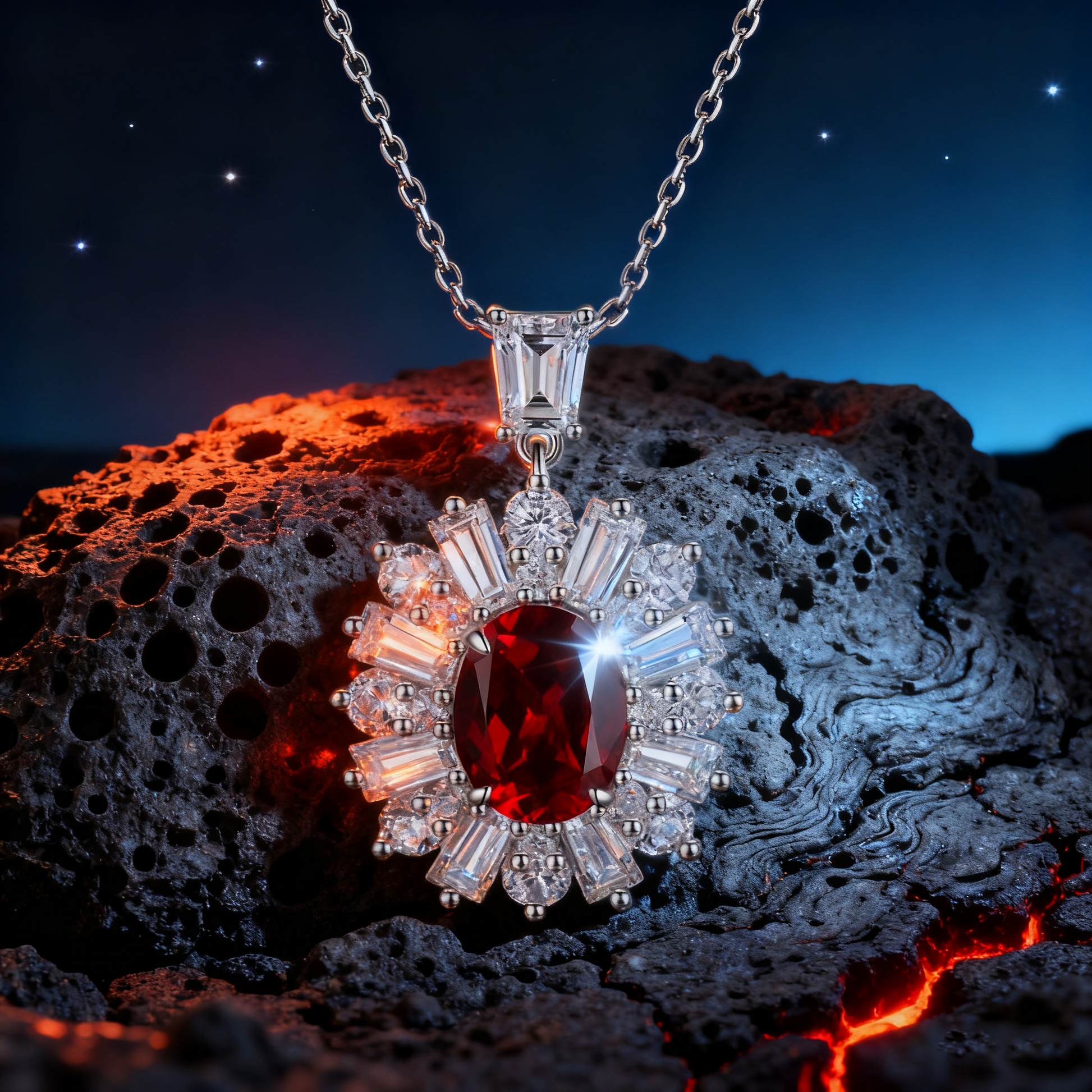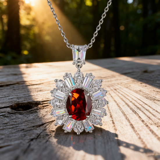 A masterpiece of passion and elegance, the Eternal Flame pendant captures the essence of love and inner strength. A radiant 4.00 carat vivid ruby ignites at the center, surrounded by a meticulously handcrafted halo of baguette and brilliant-cut diamonds, symbolizing light radiating from the heart. Suspended on a delicate chain, this statement piece glows with fiery brilliance and timeless sophistication.