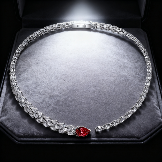 Bold yet graceful, Mia Liora’s 2.00ct Modern Ruby Drop & Lab-Grown Diamond Choker Necklace redefines contemporary elegance with a touch of timeless allure. The centerpiece, a vivid pear-cut ruby, radiates passion and sophistication, seamlessly framed by an intricate collar of brilliant lab-grown diamonds. Each diamond, hand-selected for its D–F color and VVS/VS clarity, is expertly set in a sculptural design that enhances both fluidity and light reflection. Crafted in PT950 Platinum or 18K Gold, this piece sits elegantly at the neckline, making it the perfect statement for refined evenings or red-carpet occasions.