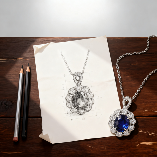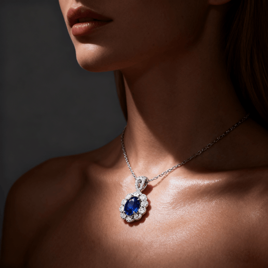 Elegant and regal, Mia Liora’s 7.00ct Royal Blue Sapphire & Lab-Grown Diamond Halo Pendant Necklace celebrates timeless beauty with exquisite craftsmanship. The centerpiece, a deep royal-blue sapphire in a refined oval cut, is gracefully encircled by a halo of dazzling lab-grown diamonds that accentuate its vibrant hue and brilliance. Each diamond, graded D–F color and VVS/VS clarity, enhances the pendant’s luminosity, creating a look of classic sophistication and modern refinement. Handcrafted in PT950 Platinum or 18K Gold, this pendant necklace embodies the perfect harmony of color, craftsmanship, and ethical luxury.