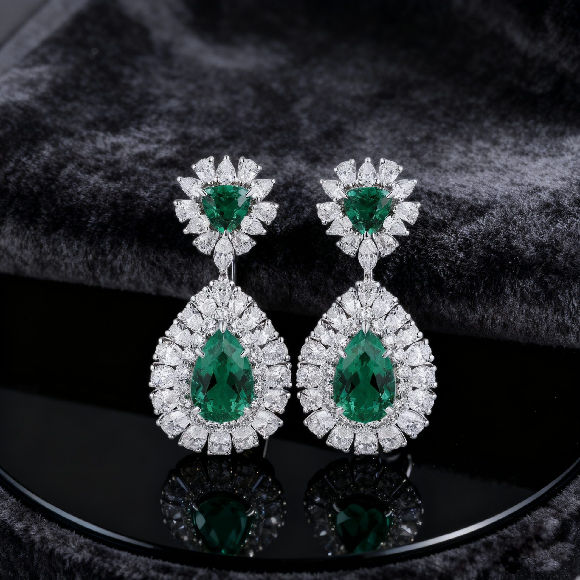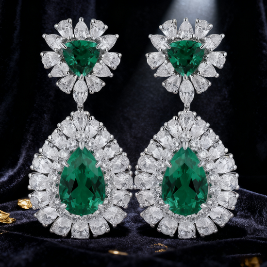 A striking creation from the Verdant Grace collection, these double halo drop earrings feature brilliant green emeralds paired with high-clarity lab grown diamonds. Each side showcases a 1.00ct emerald at the top and a 2.50ct pear-cut emerald drop, surrounded by a radiating double halo of diamonds that enhances depth, color and brilliance.