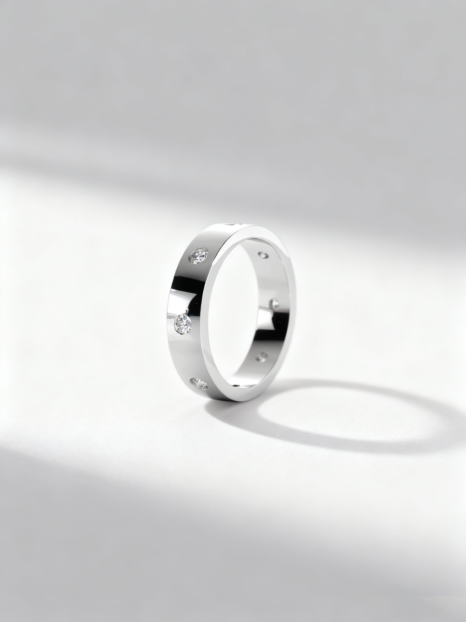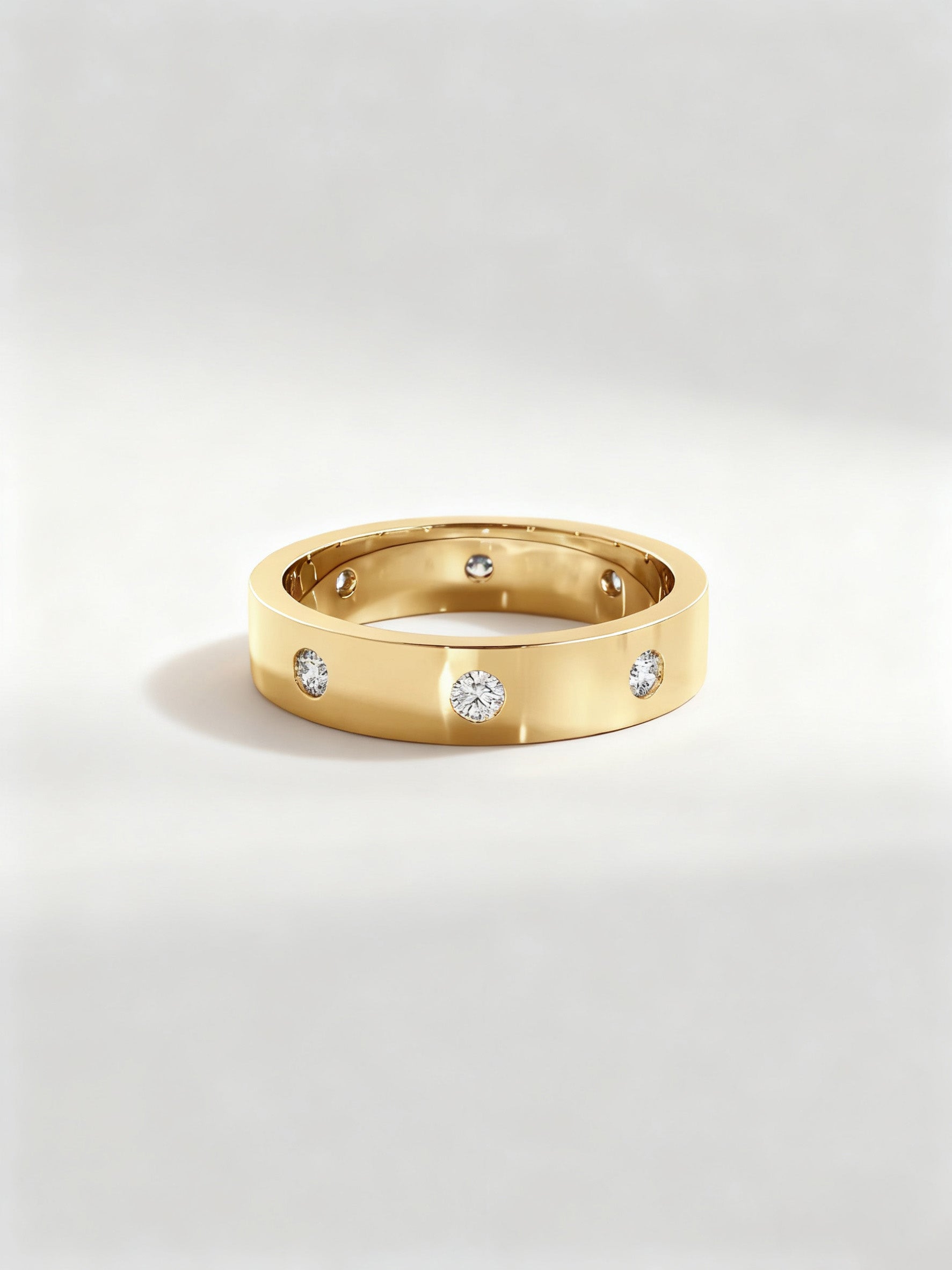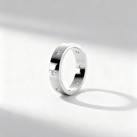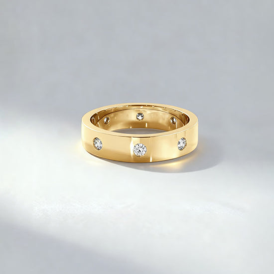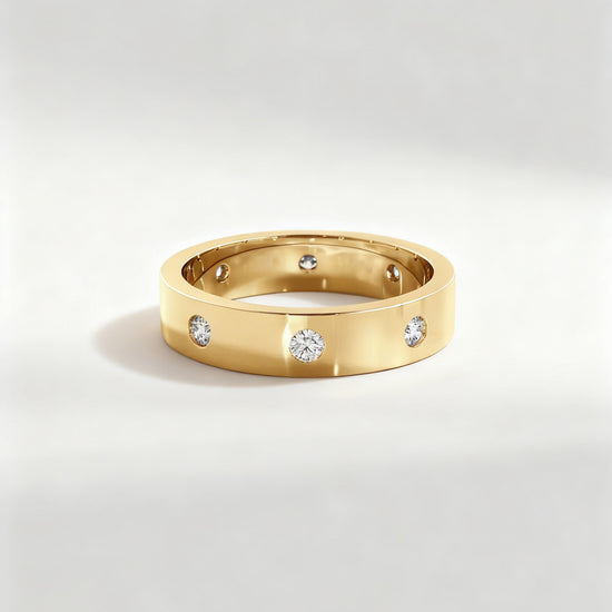 A sleek and modern men’s band designed for those who appreciate a subtle yet luxurious touch. This ring features evenly spaced round brilliant diamonds set flush into the band, creating a clean dotted pattern with refined sparkle from every angle. The smooth, polished finish paired with minimalist diamond accents makes this band perfect for daily wear, wedding band styling, or as a signature luxury piece. Stylish, timeless, and crafted for comfort.