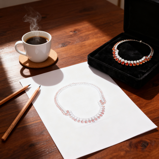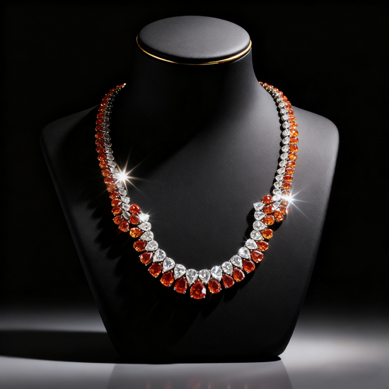 The Sunset Radiance Orange Sapphire and Lab Grown Diamond Necklace captures the fiery elegance of twilight in a masterpiece of color and light. Each vivid orange sapphire radiates warmth and passion, gradually blending into the dazzling brilliance of lab grown diamonds that reflect pure luminosity. The seamless gradient of color evokes the golden glow of a setting sun, while the symmetrical design and refined craftsmanship express timeless sophistication. Crafted in PT950 Platinum or 18K Gold, this necklace embodies confidence, artistry, and modern luxury in perfect harmony.