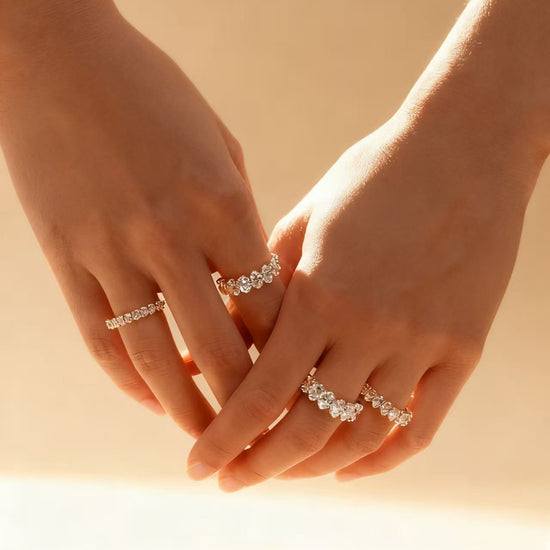 The Venlis.V 0.10 ct Round Cut half Eternity Diamond Simulant Ring (1.00 ct in total) is a timeless symbol of continuous brilliance. Featuring round cut diamond simulants of approximately 10 points each, the stones encircle the entire band to create uninterrupted sparkle from every angle. Elegant, versatile, and luxurious, this full eternity ring is perfect as a wedding band, anniversary ring, stacking piece, or a refined standalone statement.