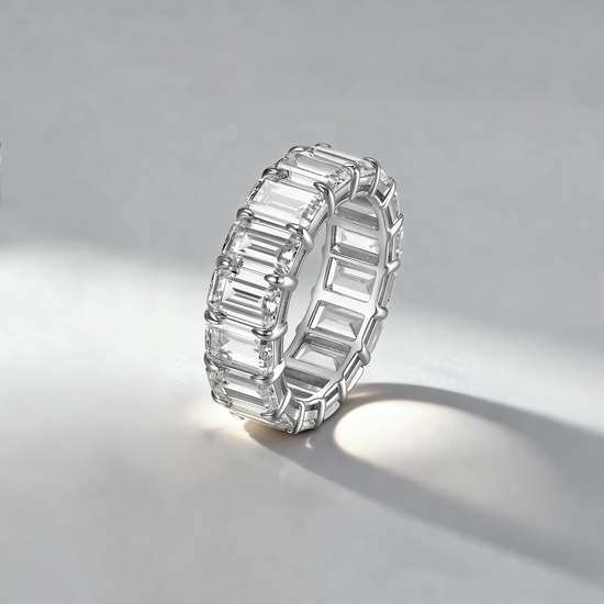 The Venlis.V Emerald Cut Diamond Simulant Full Eternity Ring delivers a sleek and modern expression of luxury. Featuring emerald cut diamond simulants of approximately 50 points each, the stones form a continuous full circle that showcases clean lines, refined geometry, and radiant step cut brilliance. This timeless eternity design is ideal as a statement ring, anniversary band, or a sophisticated stacking piece for everyday elegance.