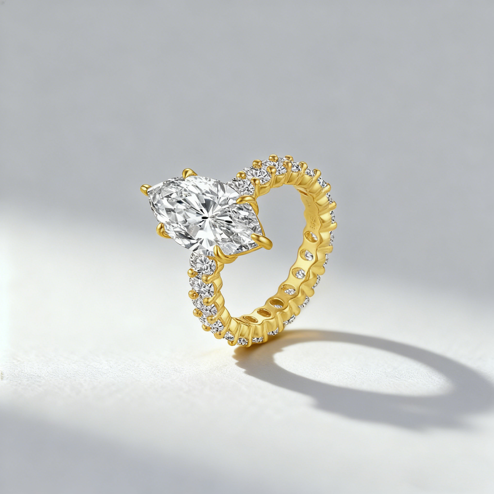 The Venlis.V 3.50 ct Marquise Cut Diamond Simulant Eternity Ring is designed to radiate striking brilliance from every angle. The centerpiece features a 3.50 ct marquise cut diamond simulant, admired for its elongated silhouette and graceful sparkle. Surrounding the band are continuous round cut diamond simulants, creating an eternity effect that adds volume, elegance, and exceptional shine. This is an eye catching statement ring perfect for both glamour occasions and elevated everyday style.