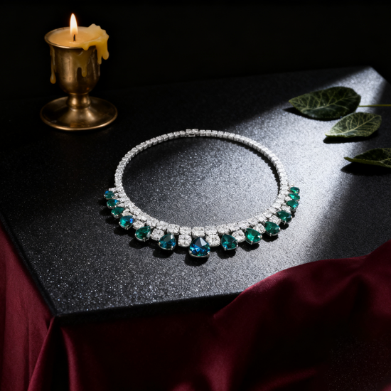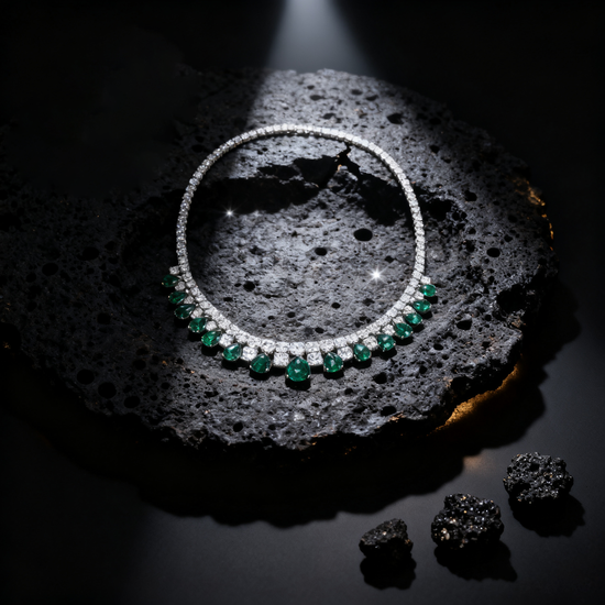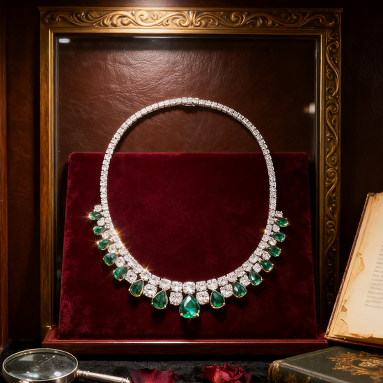 A statement of elegance and serenity, the Verdant Grace Necklace captures nature’s purest allure. Each pear-cut emerald glimmers like dew beneath morning light, embraced by a symphony of brilliant diamonds in a cascading silhouette. Handcrafted to perfection, this piece embodies timeless sophistication — a harmony of grace, power, and beauty.