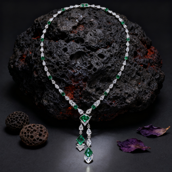 The Verdant Grace Emerald and Lab Grown Diamond Lariat Necklace captures the essence of timeless sophistication and natural vitality. Featuring a cascade of vivid green emeralds complemented by brilliant lab grown diamonds, this elegant Y-shaped design elongates the neckline with effortless grace. Each emerald is hand cut to perfection and framed by sparkling diamonds, creating a mesmerizing rhythm of light and color. Crafted in PT950 Platinum or 18K Gold, this necklace embodies modern refinement with classic allure — a radiant expression of strength and elegance.